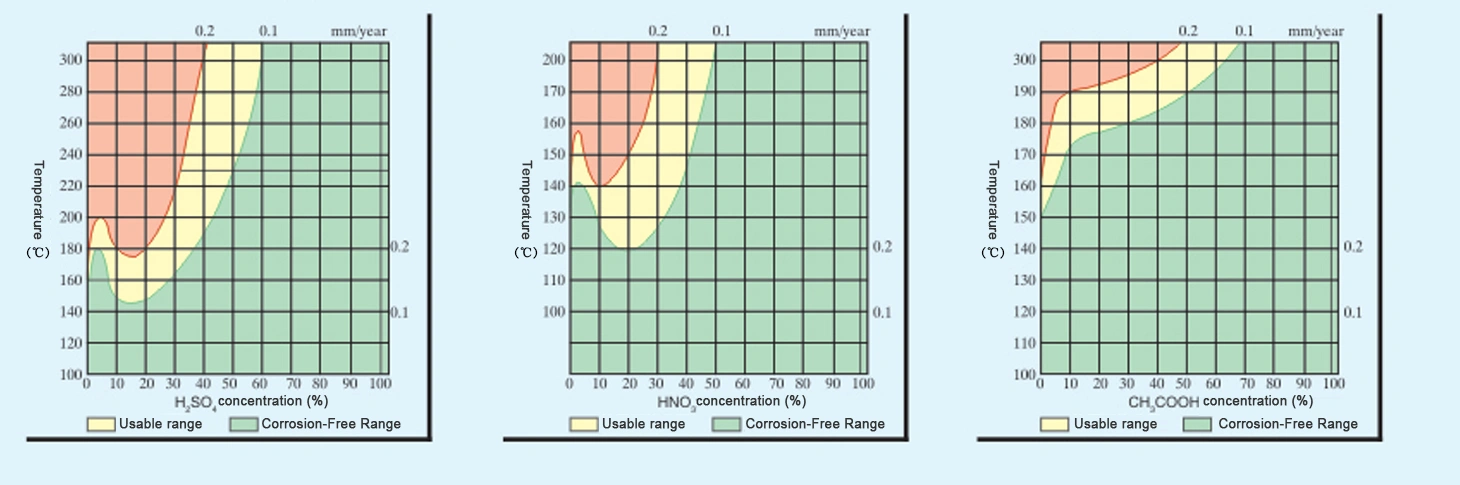 กราฟด้านล่างแสดงระดับการกัดกร่อนทั่วไปของอุปกรณ์เคลือบแก้วเมื่อสัมผัสกับกรดและด่าง จากการทดสอบต่อเนื่องระยะยาว